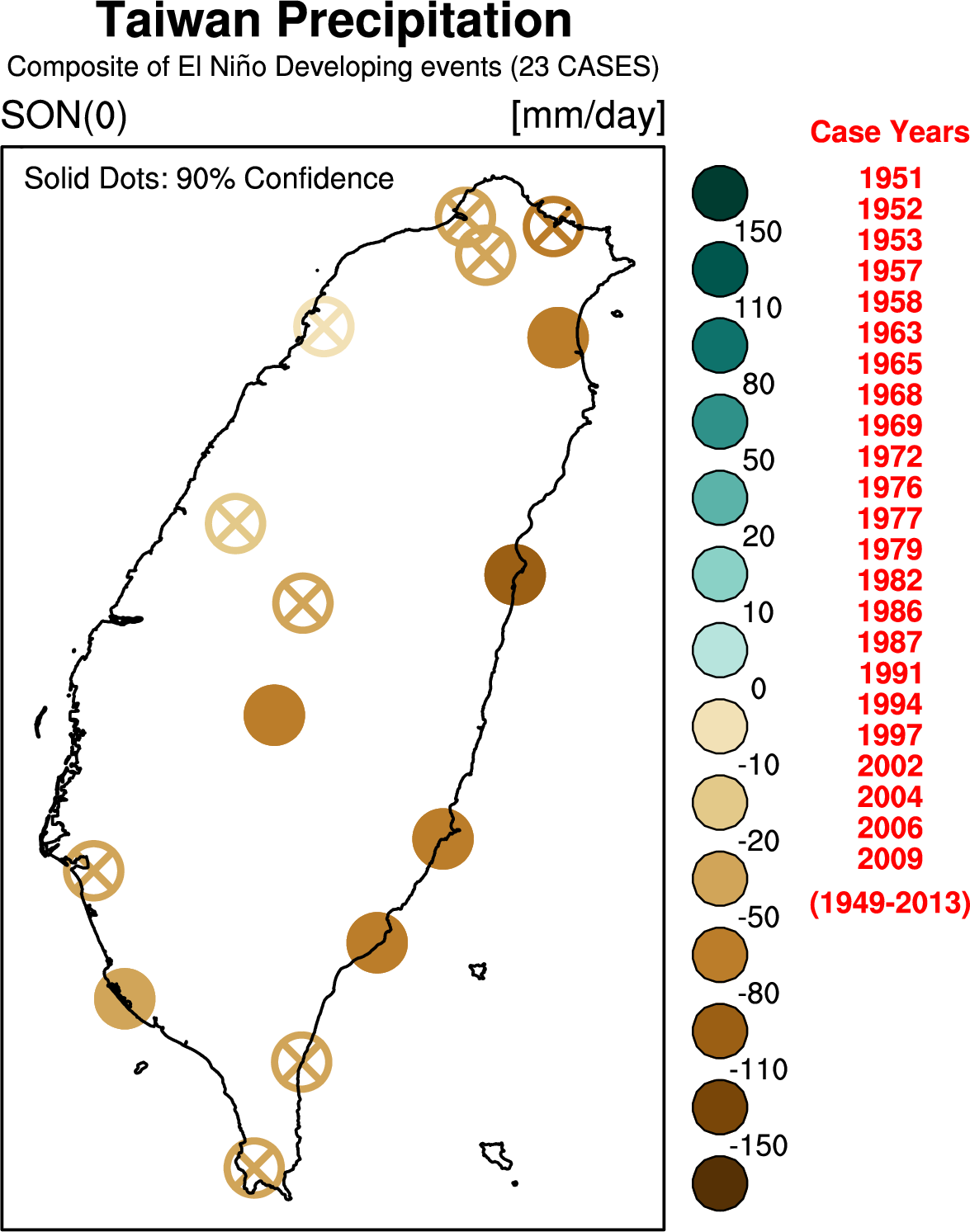 - 聖嬰(反聖嬰)事件的年份選取參考美國氣候預報中心(CPC)聖嬰事件定義,依據ONI指標值篩選出連續5個月高於(低於)攝氏+0.5(-0.5)度的事件年份,並按事件發展至成熟階段前後,分成發展年/後一年的春季(3-5月)、夏季(6-8月)、秋季(9-11月)和冬季(12-2月)進行合成分析。