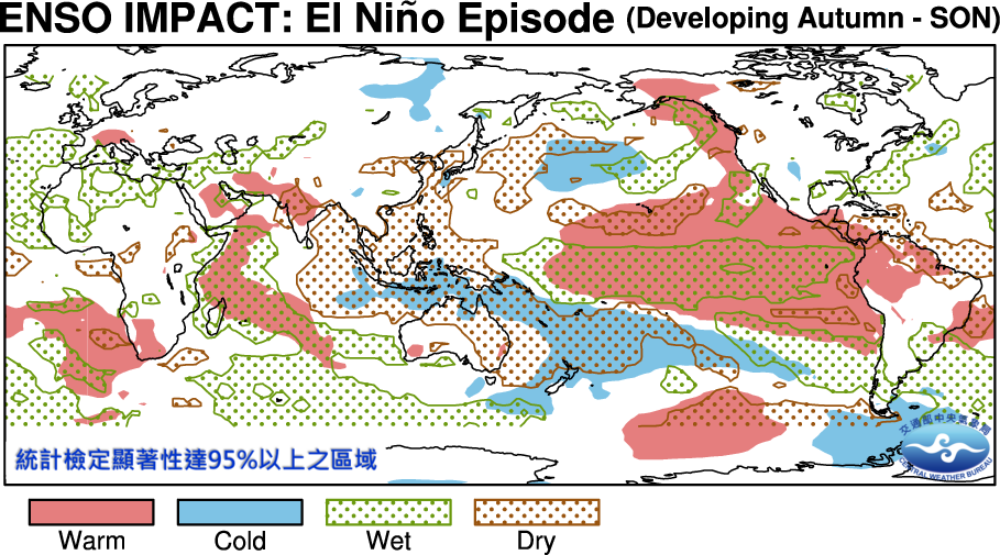 註2:影響示意圖僅採用資料具有統計意義(即統計檢定顯著性達95%以上)之區域。其中氣溫暖冷分別以紅色、藍色陰影區表示,降雨溼乾分別以綠色、褐色點狀區表示。