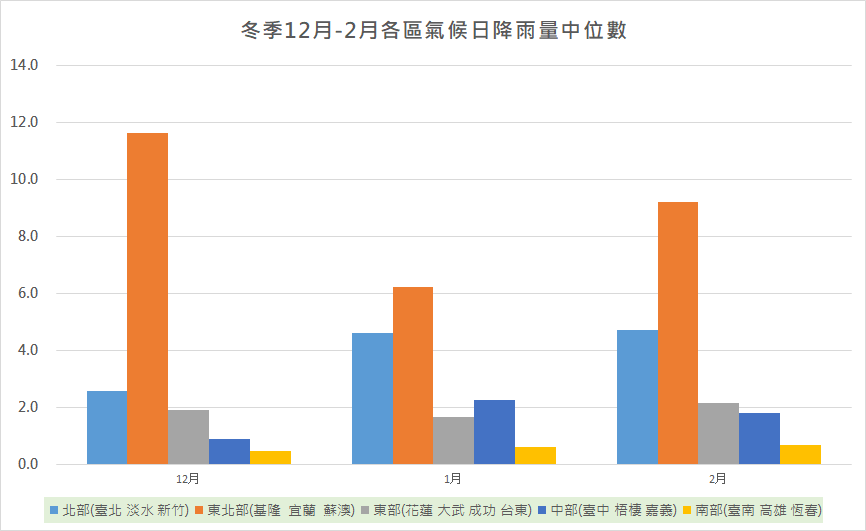 北部地區雨量在進入冬季的12月,與秋季的11月份相近,略超過每日2毫米,但1月及2月時開始增加為接近每日5毫米。東北部入冬之後雨量較秋季減少,但仍為整年中降雨次多的一段時間,不過各月份間雨量變化幅度較大。東部的降雨延續秋季逐月減少趨勢,冬季時更由11月的每日不到4毫米進一步減至每日2毫米左右。中南部地區在冬雨時節的雨量,則仍延續秋末以來不易下雨的特色。